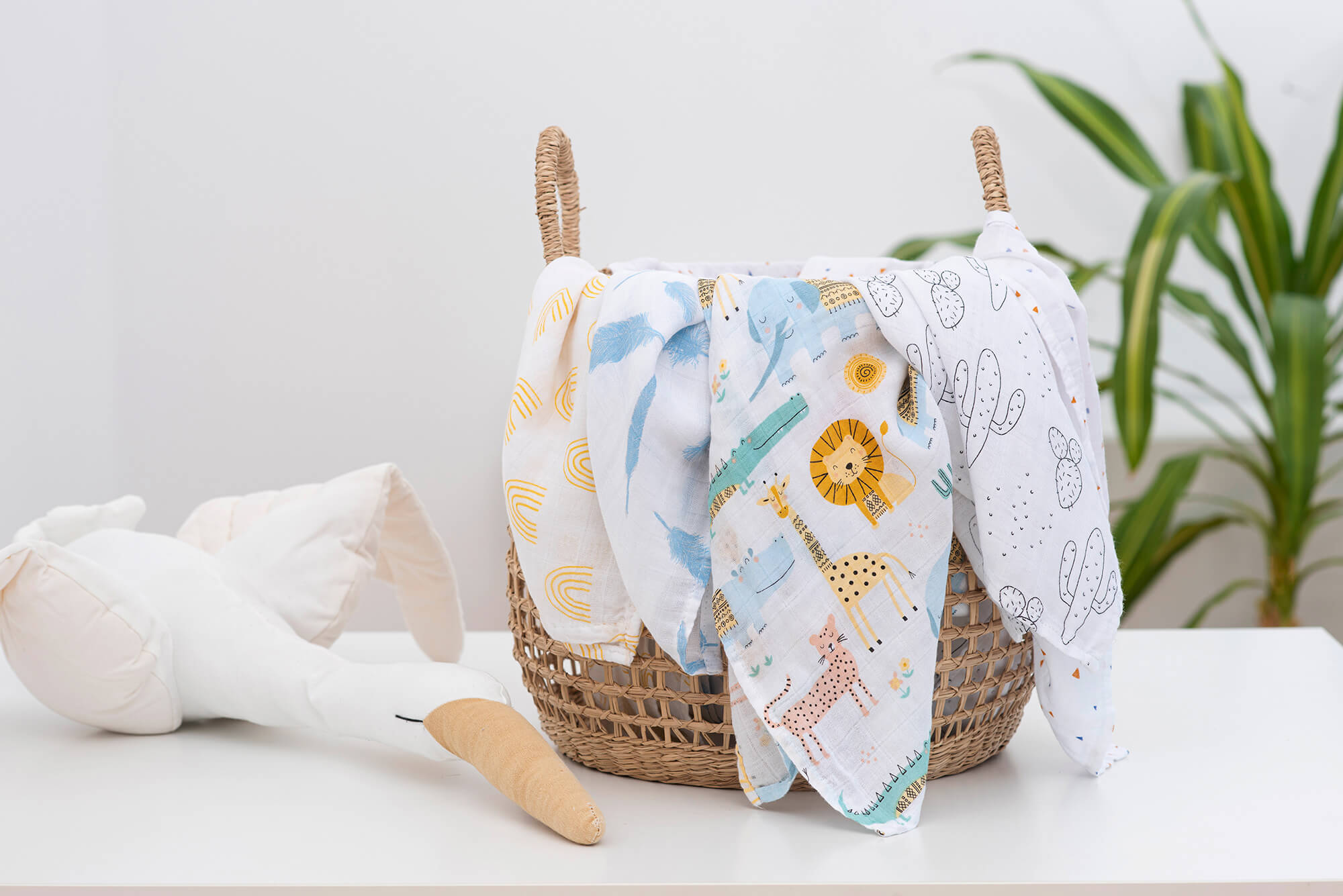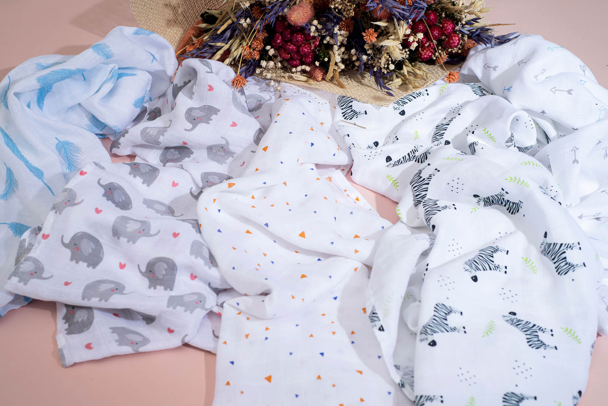 That depends on your choice. We offer sets of 3 or 5 muslin squares, all neatly packed in a gift-ready box.
